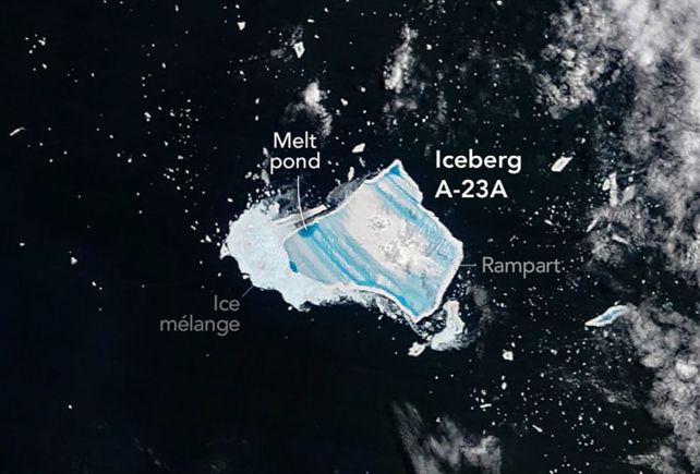 Earth satellites that have been monitoring iceberg A-23A over decades show that, in a very short space of time, the massive, crumbling berg went from snowy white to vivid cyan as meltwater pooled in cavities on its surface.