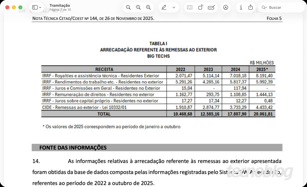 Em 21/11, o Tecnoblog e outros veículos de imprensa divulgaram que a arrecadação a partir de remessas ao exterior seria de R$ 289 bilhões, com base num ofício da Receita Federal. Agora, um documento mais recente também da Receita mostra que o valor (ainda bilionário) é bem mais baixo, conforme a tabela a seguir.