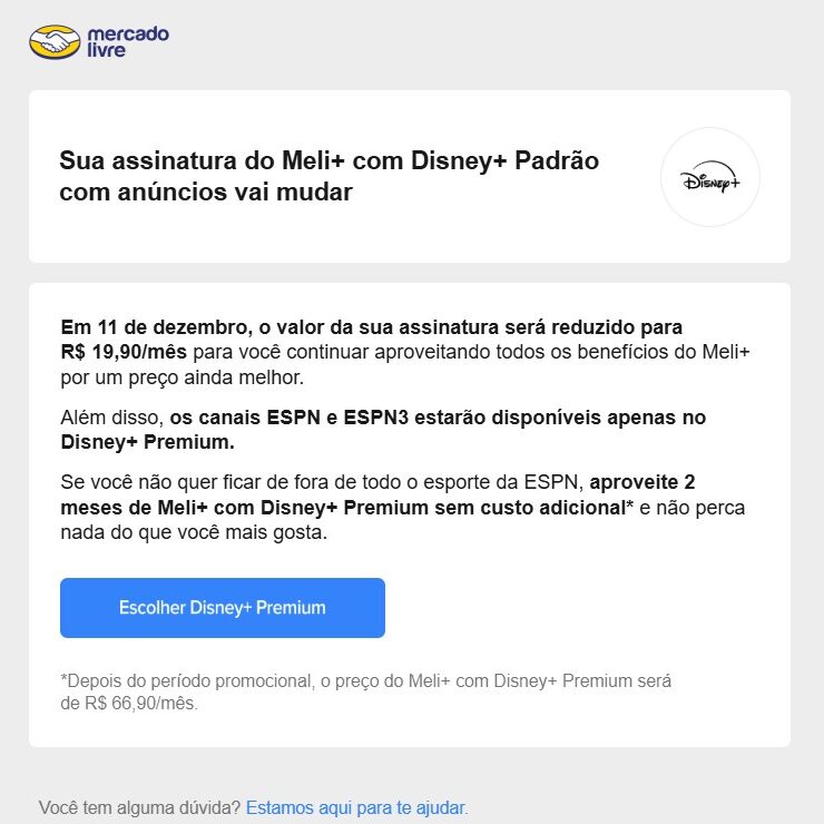 No caso do Mercado Livre, os clientes podem optar pela assinatura do Meli+ combinado com o serviço Disney+ Premium. O custo, no entanto, é bem mais salgado: R$ 66,90 por mês.