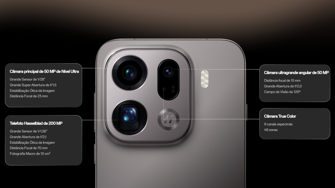 Já em questões de filmagens, o Oppo Find X9 Pro assegura gravações profissionais em até 4K Dolby Vision a 120 fps, com dupla estabilização de imagem (OIS e EIS) e função para filmar em câmera lenta.