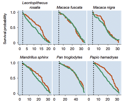 Survival responses among captive female primates. Female hamadryas baboons (Papio hamadryas) who received hormonal contraception (red line) had a higher survival probability than non-contracepted (green) baboons. Golden lion tamarins (Leontopithecus rosalia) showed a similar effect. (Garratt et al., Nature, 2025)