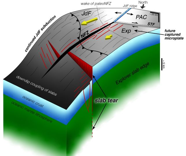 There, in the so-called Cascadia subduction zone, four plates meet: the Explorer, Juan de Fuca, Pacific, and North American plates, with the former two actively sliding beneath the North American plate.