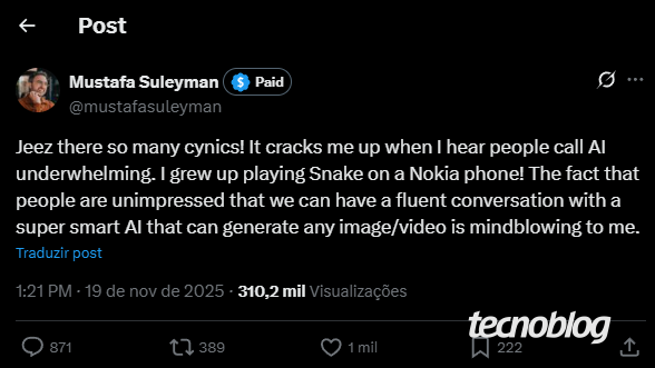 Suleyman rebateu essa perspectiva: disse que aqueles que não se impressionam com a tecnologia atual, capaz de gerar imagens, vídeos e textos instantaneamente, estão adotando uma postura cínica. Ele comparou o momento a outras ondas tecnológicas, sugerindo que a importância da inovação está sendo subestimada pelo público geral, que ainda vê a IA como um tema controverso.
