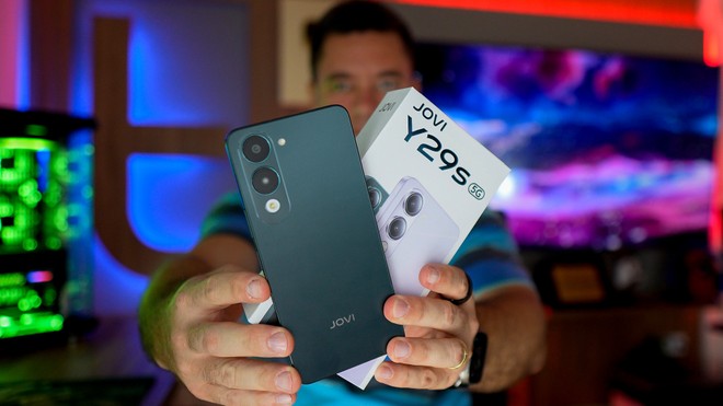O JOVI Y29s é uma das várias apostas da marca chinesa no Brasil. Esse modelo tem construção simples, mas resistente, com corpo fosco, módulo de câmera discreto e certificação MIL-STD-810H. A pegada é firme, e a conectividade completa reforça sua proposta funcional. O visual frontal, porém, permanece básico com entalhe em gota.