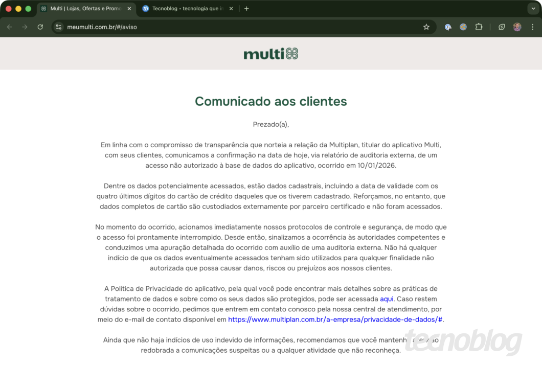 Ainda não se sabe o número de potenciais vítimas. O Tecnoblog entrou em contato com a Multiplan e este texto será atualizado caso a empresa nos responda.