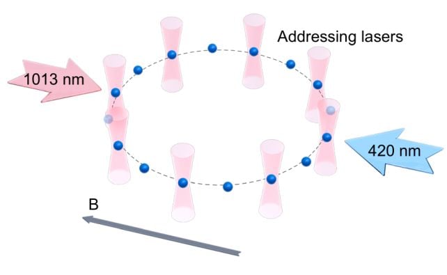 The researchers arranged an even number of mutually repulsive Rydberg atoms in a ring. In this arrangement, each atom falls into a spin alignment opposite to the atom on either side, so you get a symmetrical, alternating pattern of spin alignments around the ring.