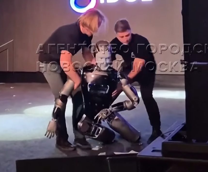 O primeiro robô humanoide com inteligência artificial da Rússia, batizado de Aidol, chocou o público ao cair durante sua apresentação oficial. A máquina perdeu o equilíbrio quando entrava no palco, ao som da trilha sonora do filme Rocky, deixando peças espalhadas pelo chão. Funcionários tentaram escondê-la atrás de uma tela para os reparos.