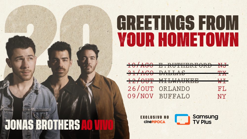 Neste domingo, 26 de outubro, o Samsung TV Plus levará os Jonas Brothers mais uma vez para as casas dos telespectadores! O Canal Cine Pipoca (2000) exibirá ao vivo o show de Orlando, apresentando Kevin, Joe e Nick Jonas em uma nova performance vibrante da turnê Jonas20: Greetings From Your Hometown.