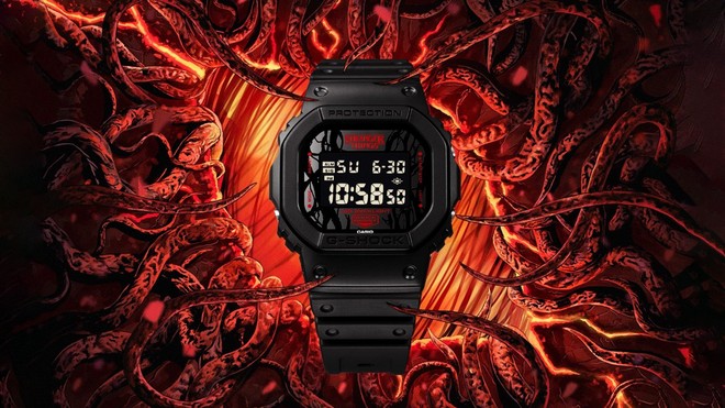 Enquanto a primeira colaboração entre a marca e a Netflix trazia uma vibe mais retrô, tomando como base o modelo A120WE da fabricante japonesa de relógios, a nova collab toma para si o famoso G-Shock DW-5600 e adiciona vários detalhes da série; que chega em breve a sua última temporada.