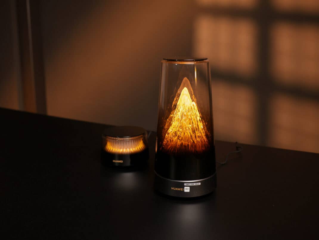 The reason you’re considering the Mesh X3 Pro in the first place is the design. To be more specific, the lighting design. With the Mesh X3 Pro, Huawei launched a router that you have never seen before. The main router reminds a child from the 1980s or 1990s who was fascinated with a lava lamp, albeit sans any movement. The shape of the router is a tapered “rocket” which is primarily made of Plexiglas. Inside lies an illuminated volcano. You can determine the effects, brightness, and color temperature of the volcano in the app. This includes schedules and countdowns (for instance, “turn off in 30 minutes”). The color temperature ranges from 2,000 to 7,000 Kelvin. The brightness can be adjusted down for night use or completely deactivated. The satellite also has light and similar routines, but its appearance is far simpler due to its completely different design.