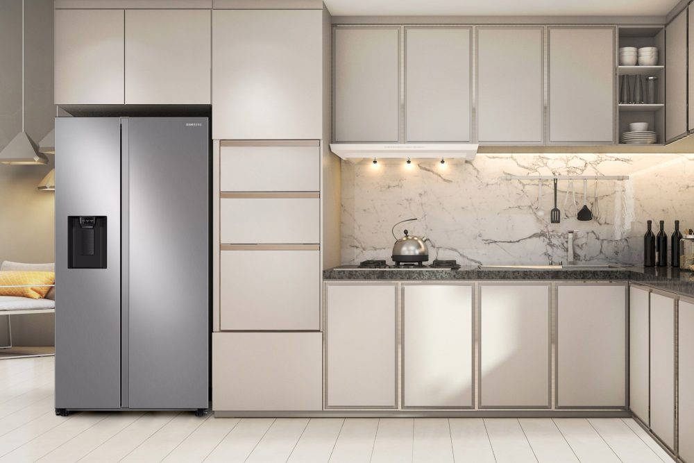 Bom exemplo do foco da Samsung em oferecer produtos para diferentes perfis e estilos de vida está na linha de geladeiras da marca. Entre os produtos mais buscados do período, a geladeira side by side com dispenser de água na porta se destaca. A Side by Side RS60 entrega isso e ainda pode produzir 1,5kg de gelo por dia, além de armazenar 2kg. São 602 litros de capacidade interna, com a exclusiva tecnologia SpaceMax™, que tem paredes mais finas e aumenta o espaço interno, sem aumentar as dimensões externas. Na parte de fora, nada de marcas de digitais, com o acabamento que resistente que mantém a geladeira limpa e brilhante.